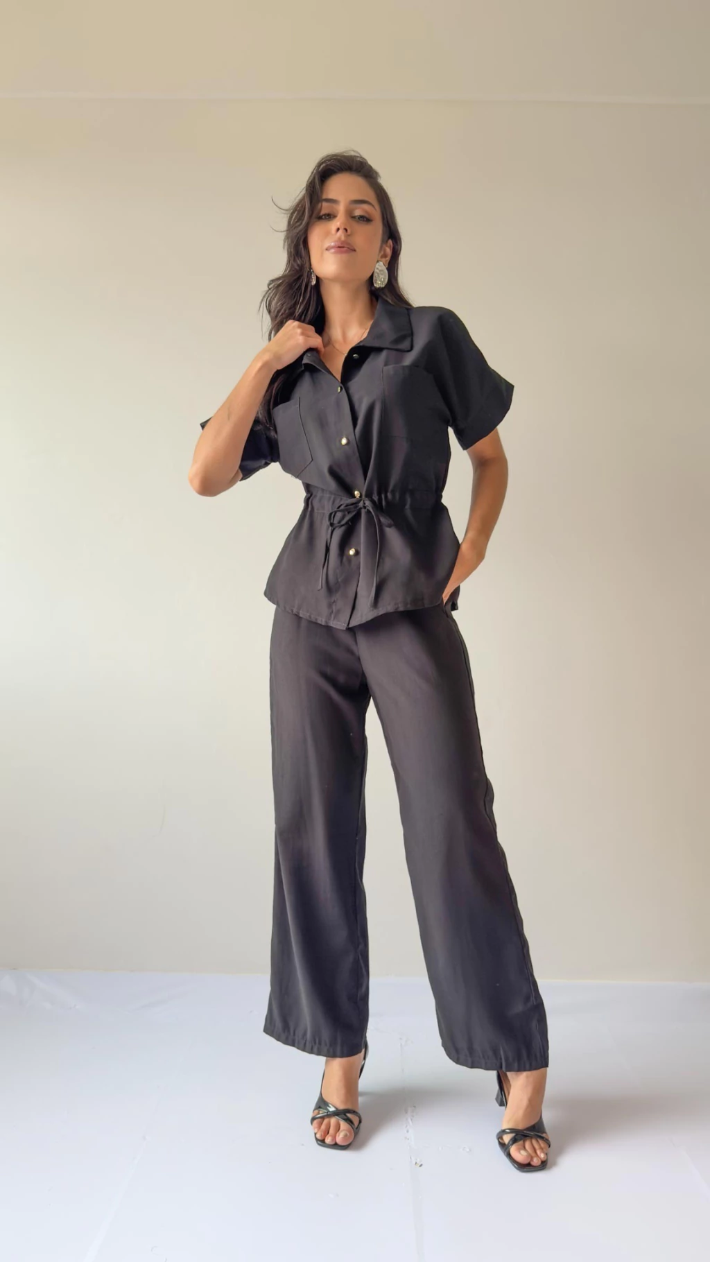 Confeccionado em tecido de sarja/linho, o Conjunto Vania é a perfeita combinação entre elegância e conforto. A camisa com ajuste na cintura valoriza a silhueta com leveza, enquanto a calça de modelagem reta garante um caimento impecável e moderno.